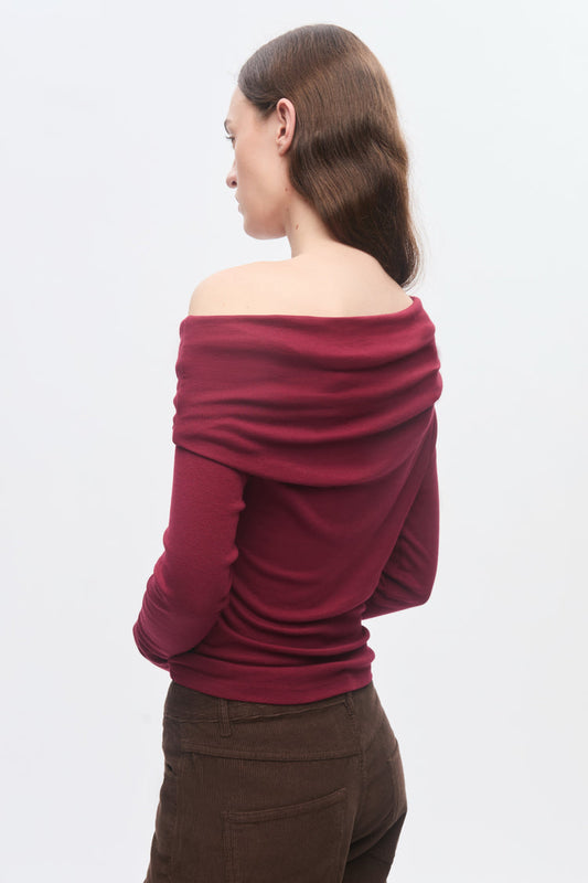 Zahra Cotton and Modal Off Shoulder Long Sleeve Top in Cabernet Red
