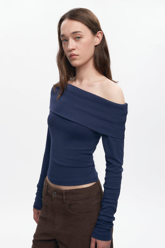 Zahra Cotton and Modal Off Shoulder Long Sleeve Top in Midnight Blue