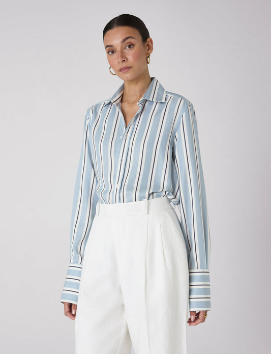 Boyfriend Exaggerated Cuff Tencel Button Down Shirt in Slate and Blue Stripe