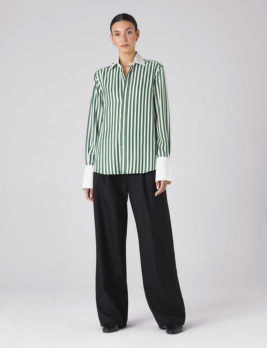 Boyfriend Exaggerated Cuff Tencel Button Down Shirt in Forest Green Stripe