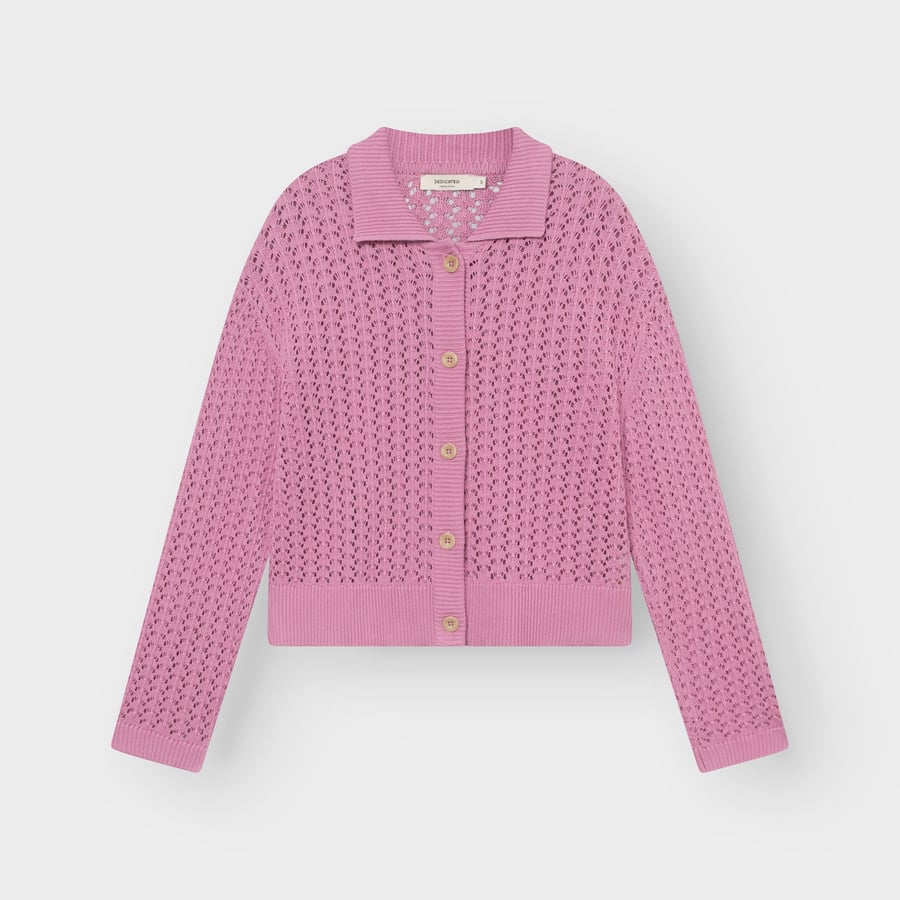 A breezy knitted cardigan with a regular fit and slightly cropped length, made in a crochet-inspired pointelle for light texture. Black with an open pointelle pattern that gives a subtle, airy look. The fit sits neatly on the shoulders and frames the body with a deep V-neck and ribbed trims for a clean finish. Knitted in organic cotton and GOTS certified for dependable quality. Style it over a tank with high-waisted jeans, or buttoned up with a midi skirt.