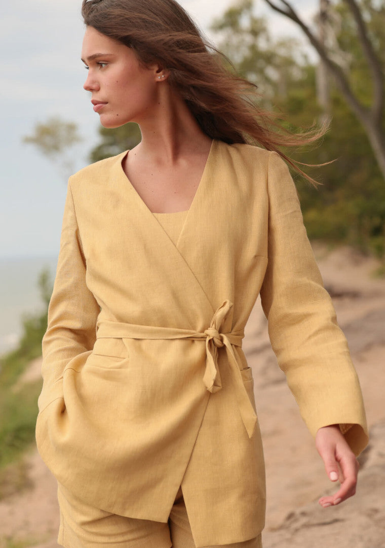 • Relaxed wrap silhouette • Long sleeves • Double fabric layer • Decorative pockets • Adjustable linen belt • Blazer length: 29.5" (75 cm) • Handmade in a small European studio • Model wears size S in Beige